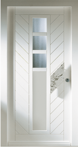 Vnější strana s drážkovaným frézováním v rybí kosti. RAL/NCS bílá nebo jiná barva, také v provedení s ochranným lakem na dřevo, přerušovaná skleněným výplní se dvěma dřevěnými příčkami nahoře a hladkou výplní dole. Vnitřní strana hladká, optimálně přizpůsobitelná interiéru.