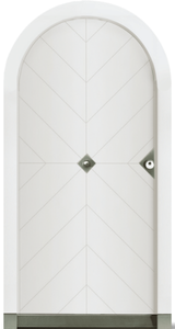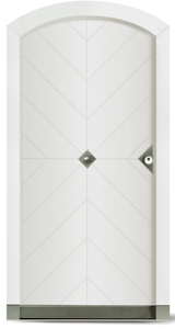 Jaspis Club – Vchodové dveře s segmentovým obloukem „Club“ s ozdobným frézováním ve tvaru rybí kosti, lakované ochranným lakem, lakované barvou RAL/NCS nebo bílou barvou a nerezovými prvky, vnitřní strana přizpůsobená obytnému prostoru.