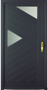Vnější strana s drážkovaným frézováním, třemi skleněnými výplněmi (trojúhelníkový tvar) a kamennými vložkami podle kolekce. Vnitřní strana optimálně přizpůsobitelná konceptu vnitřních dveří.