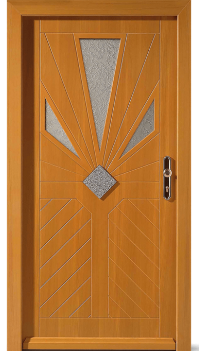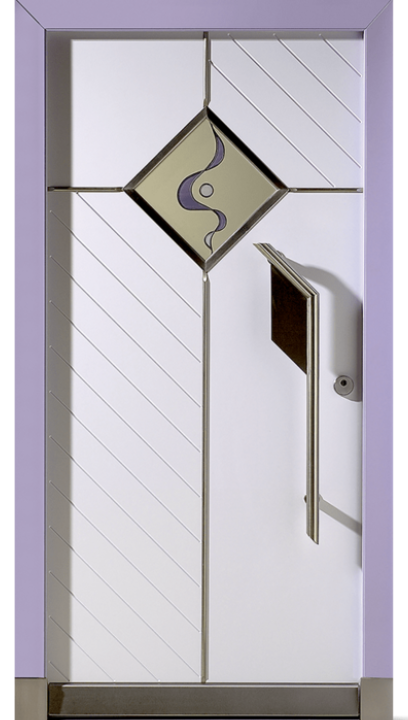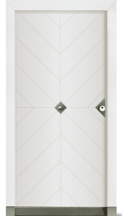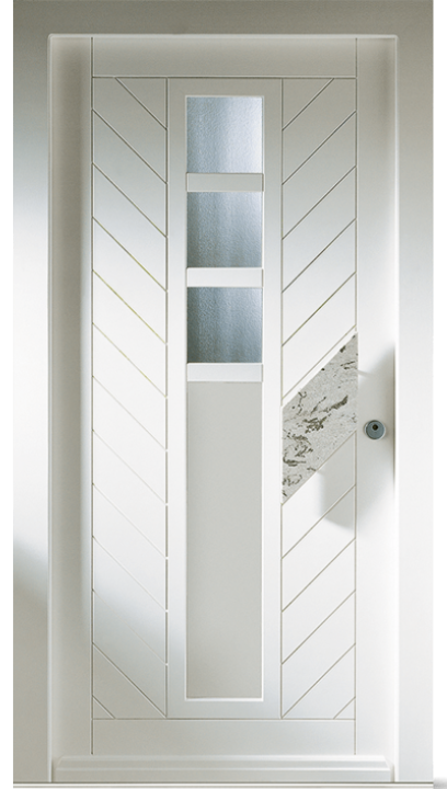 Vnější strana s drážkovaným frézováním, třemi skleněnými výplněmi (trojúhelníkový tvar) a kamennými vložkami podle kolekce. Vnitřní strana optimálně přizpůsobitelná konceptu vnitřních dveří.