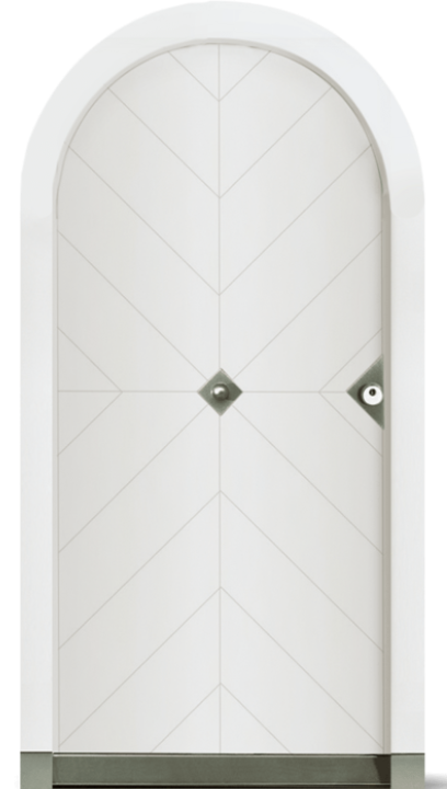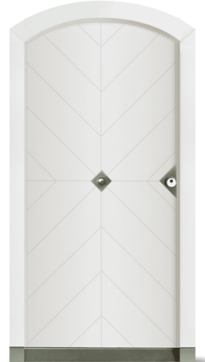 Jaspis Club – Vchodové dveře s segmentovým obloukem „Club“ s ozdobným frézováním ve tvaru rybí kosti, lakované ochranným lakem, lakované barvou RAL/NCS nebo bílou barvou a nerezovými prvky, vnitřní strana přizpůsobená obytnému prostoru.