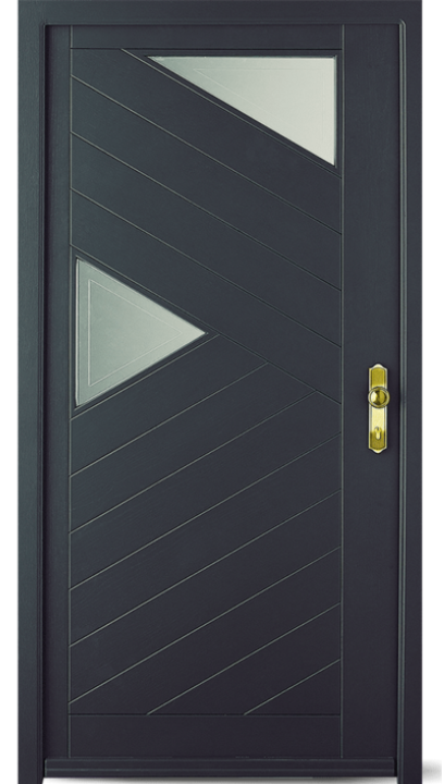 Vnější strana s drážkovaným frézováním v provedení na pero a drážku, RAL/NCS bílá nebo jiná barva, také v provedení z chráněného lakovaného dřeva. Dvě trojúhelníkové skleněné výplně v designovém skle (také trojité zasklení). Vnitřní strana optimálně přizpůsobitelná interiéru.
