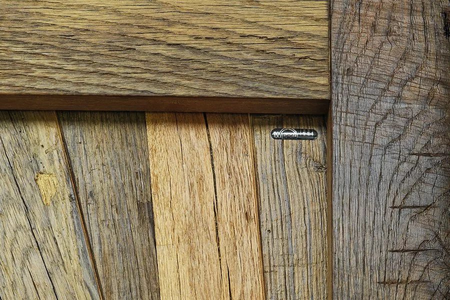 Vchodové dveře s povrchem Wippro Alpin Edition ze starého dřeva, příčně obložené, s minimální deformací, vícevrstvá lepená dřevěná konstrukce s hliníkovou vrstvou, izolovaným jádrem a tepelně odděleným prahovým a dvojitým těsnicím systémem s trojitým falcem pro vynikající tepelné a akustické izolační vlastnosti.