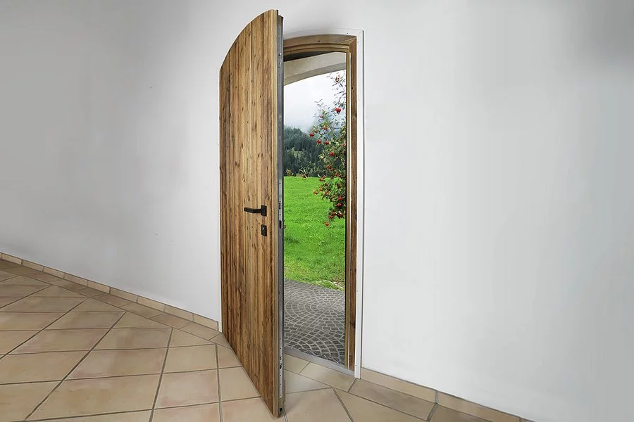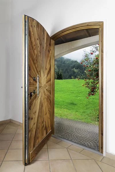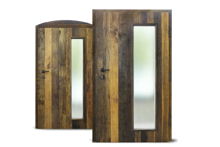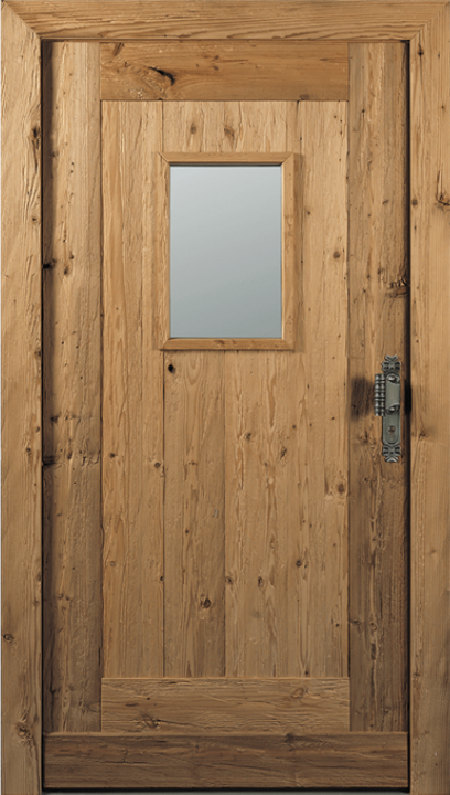 Vchodové dveře s dvojitým rámem v provedení Wippro Alpin Edition Altholz. V závislosti na druhu dřeva parní, kartáčované, sluncem spálené nebo s červotočem – vy rozhodujete, jak rustikální. Speciální provedení: modřínové prkno s drážkou a perem. Lze vyrobit jako interiérové dveře.