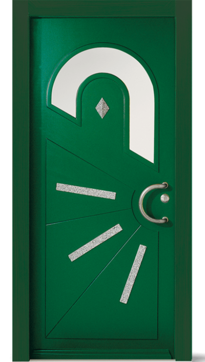 Dveře s obloukovým profilem, dole dvě hladké hranaté šikmé výplně, nahoře obloukové prosklené části, k dispozici v designovém skle. Dveřní křídlo zvenku lakované v barvě RAL/NCS nebo bílé, také s ochranným lakem na dřevo nebo s povrchovou úpravou „Exterior“ či speciálními dekory.