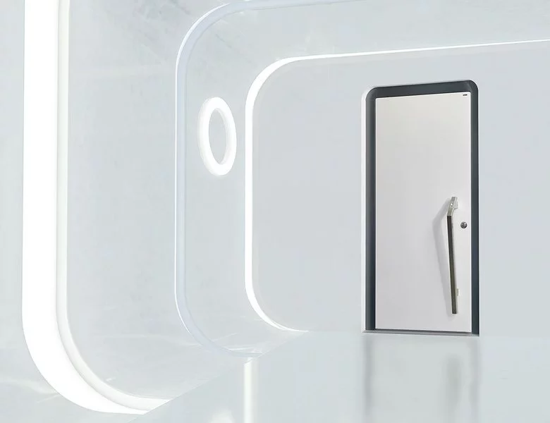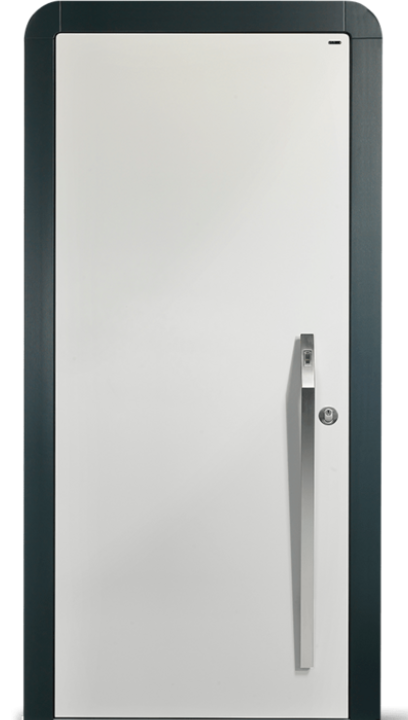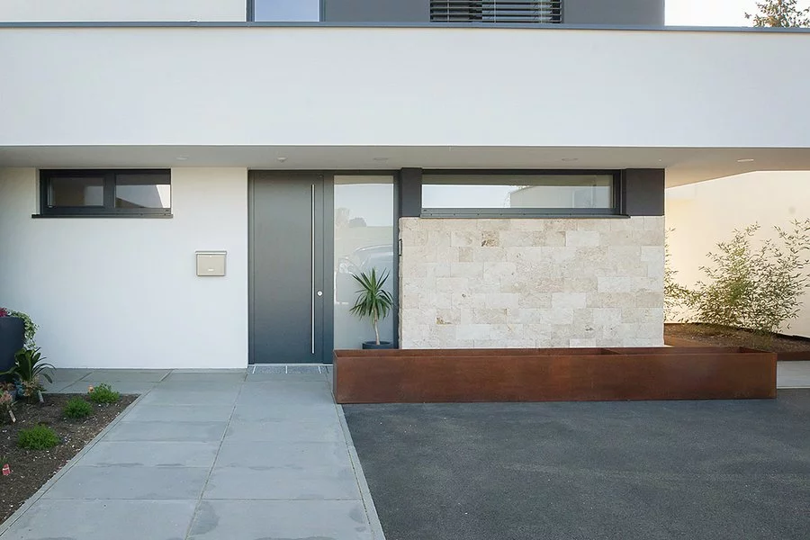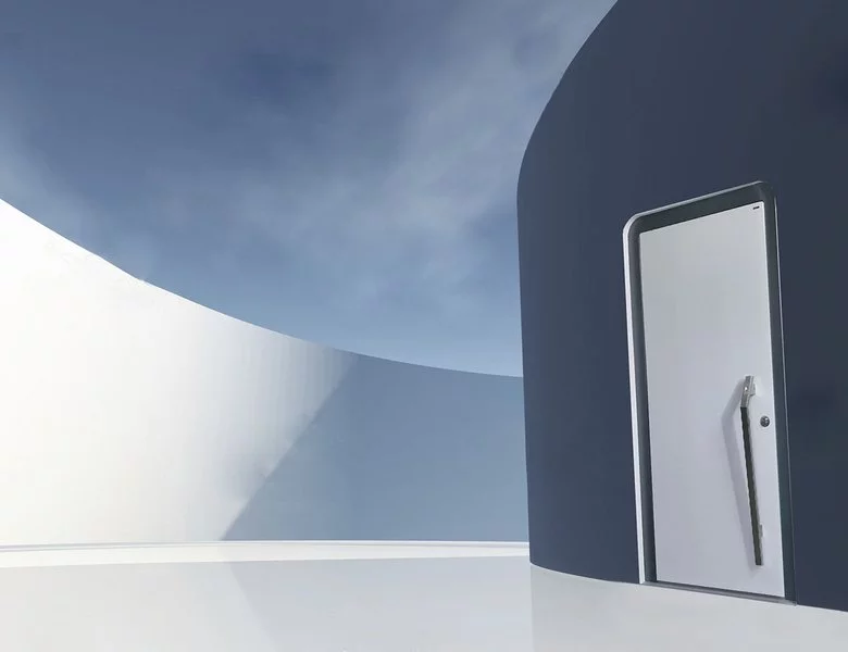 Vchodové dveře Danburit Curve (zaoblené hrany zárubně) mají jednoduchý a čistý design, díky čemuž vyniknou povrchy Wippro. Dveřní křídlo a zárubeň jsou nahoře zaoblené – design vchodových dveří ladí se systémem Smarthome.