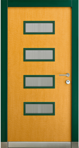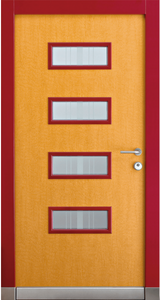 Barevné kombinace rámů a povrchů dveřních křídel v lakování RAL/NCS nebo v designu „Exterior“ či také v ochranném lakování dřeva volitelně. Čtyři obdélníkové skleněné výplně Wippro-Designglas propouštějí světlo do předsíně (počet lze měnit podle výšky dveří).