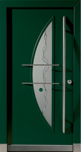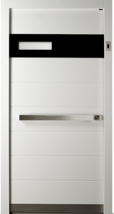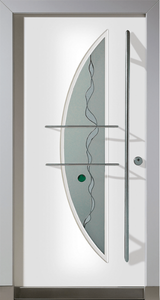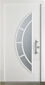 Vnější strana: dřevo s ochranným lakem, lakované barvou RAL/NCS, bílé nebo s robustním vnějším povrchem a vnitřní strana přizpůsobená konceptu vnitřních dveří. Se skleněným výplněm (designové sklo ISO V3, možné i dvojité zasklení) rovným na straně kliky a zakřiveným na straně závěsu – to vnáší světlo do vstupního prostoru.