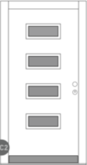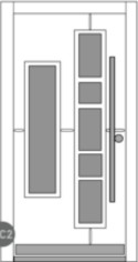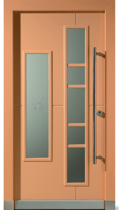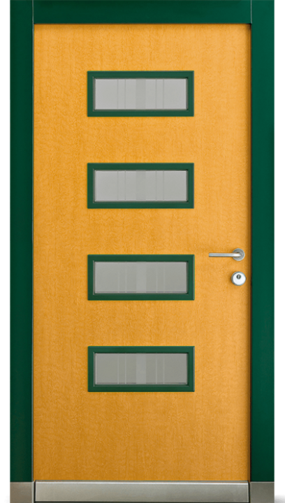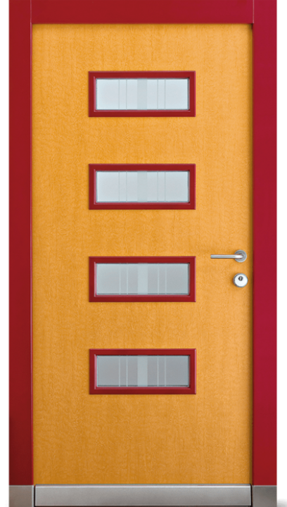 Barevné kombinace rámů a povrchů dveřních křídel v lakování RAL/NCS nebo v designu „Exterior“ či také v ochranném lakování dřeva volitelně. Čtyři obdélníkové skleněné výplně Wippro-Designglas propouštějí světlo do předsíně (počet lze měnit podle výšky dveří).