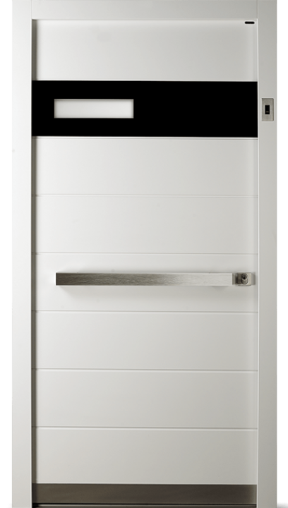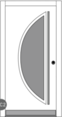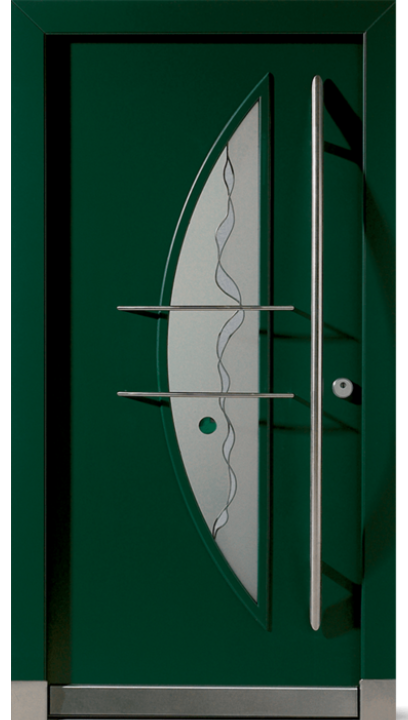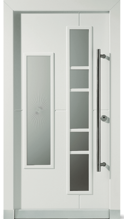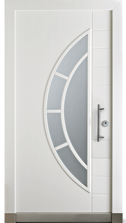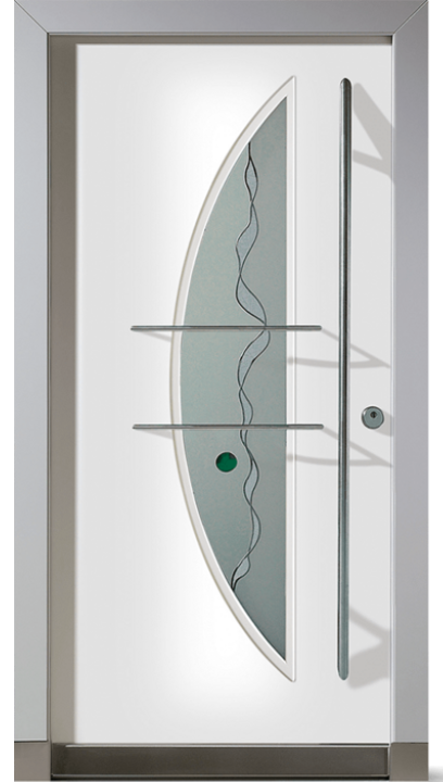 Vnější strana: dřevo s ochranným lakem, lakované barvou RAL/NCS, bílé nebo s robustním vnějším povrchem a vnitřní strana přizpůsobená konceptu vnitřních dveří. Se skleněným výplněm (designové sklo ISO V3, možné i dvojité zasklení) rovným na straně kliky a zakřiveným na straně závěsu – to vnáší světlo do vstupního prostoru.