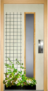 Obdélníkové dlouhé skleněné výplně na straně kliky orámované dřevěnými lištami, s mřížkou na popínavé rostliny a květinovým záhonem (prázdným).