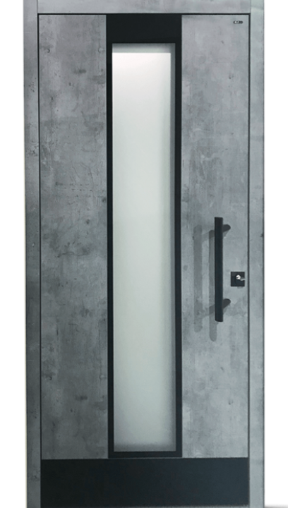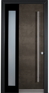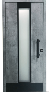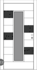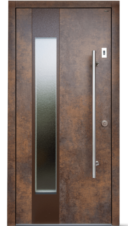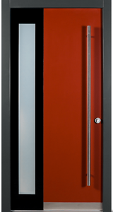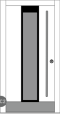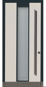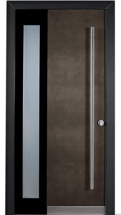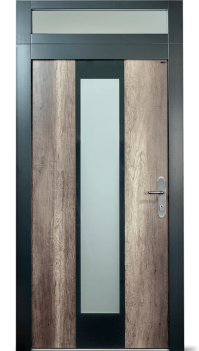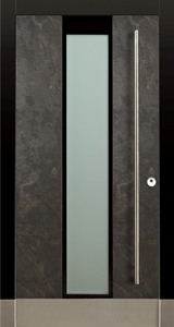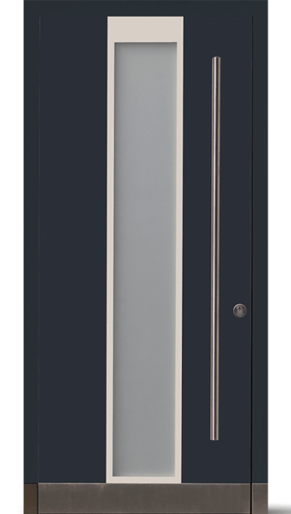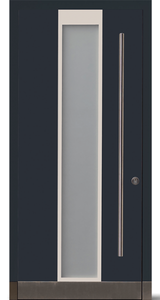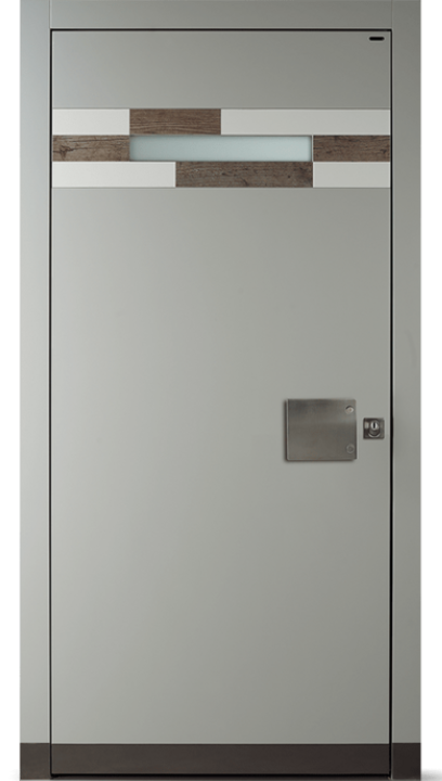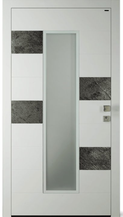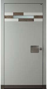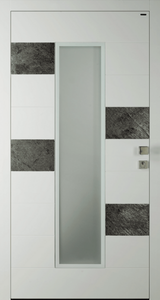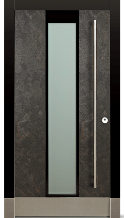 Vložte prvky své fasády jako akcent do svých vstupních dveří – např. kámen v různých exteriérových nebo RAL lakovaných vložkách. Vnější strana hladká s úzkým horizontálním skleněným prvkem v horní části. Povrchy vnitřní strany lze přizpůsobit vašemu konceptu vnitřních dveří.
