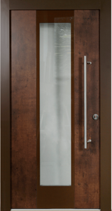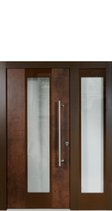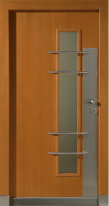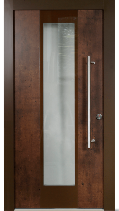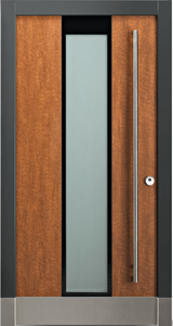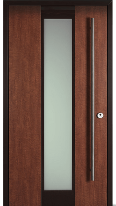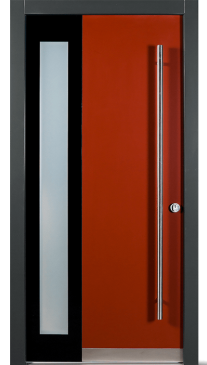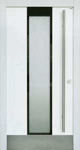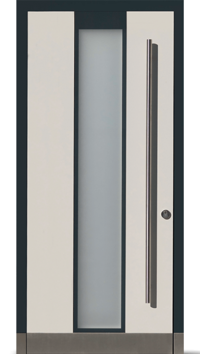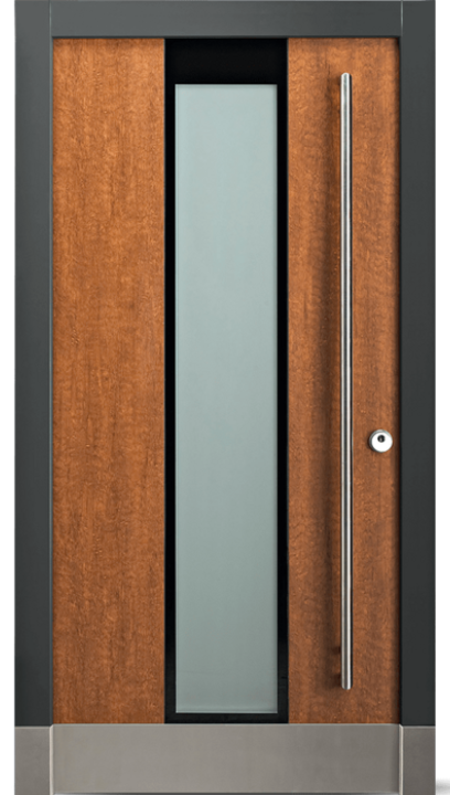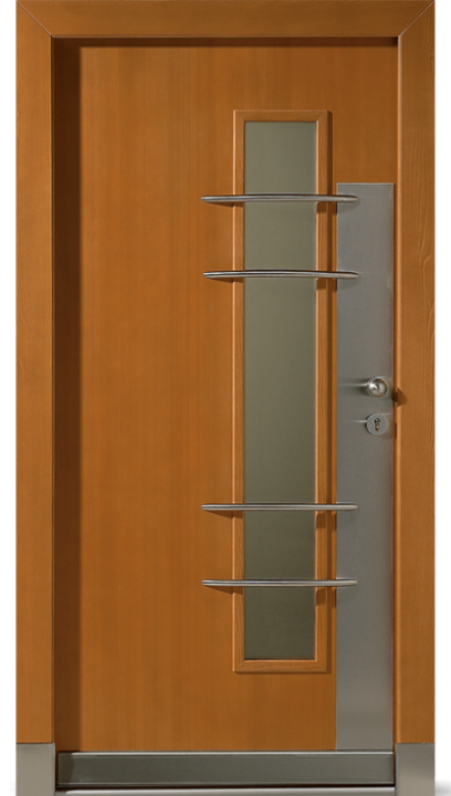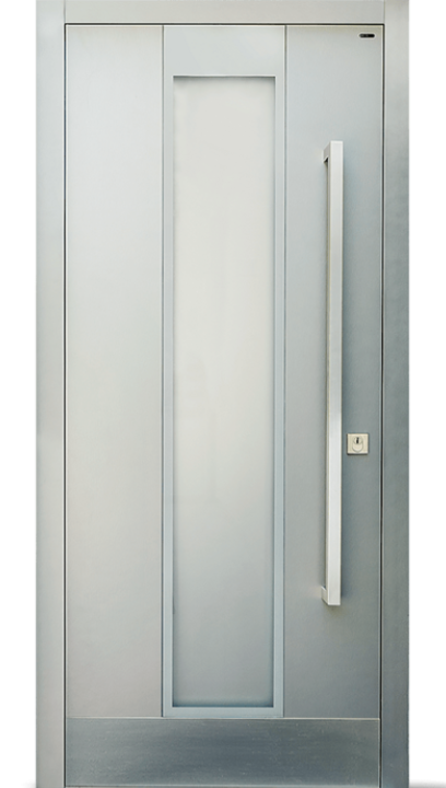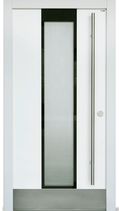Vnější dveřní křídlo s vysoce odolným povrchem „Exterior“ a zapuštěnými skleněnými výplněmi s emailovým okrajem (RAL/NCS) nebo povrchem z dřeva s ochranným lakem nebo barvou RAL/NCS, kterou lze změnit, uvnitř ladící s vaším interiérem. Takto se do předsíně dostane světlo bez nutnosti dalších nadsvětlíků nebo bočních částí. Volitelně s nerezovým okapníkem.