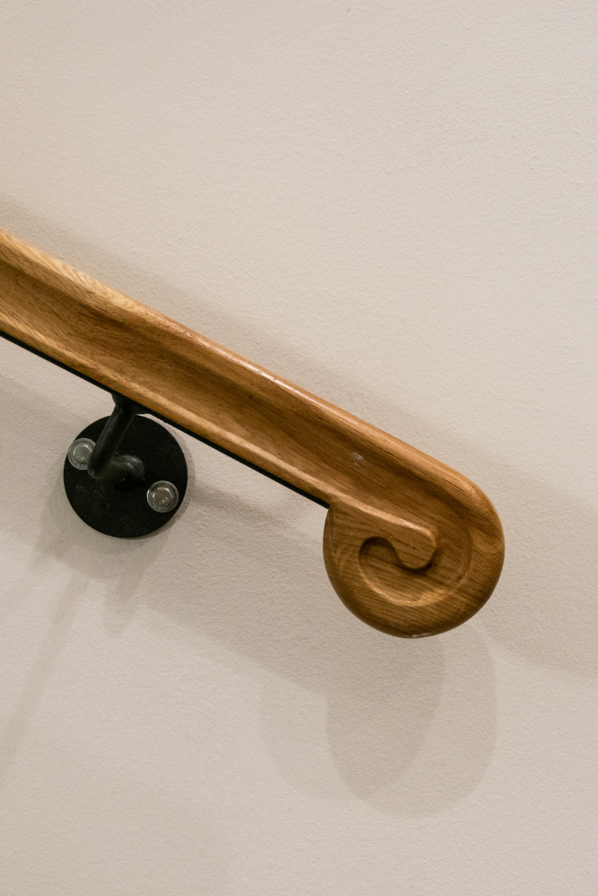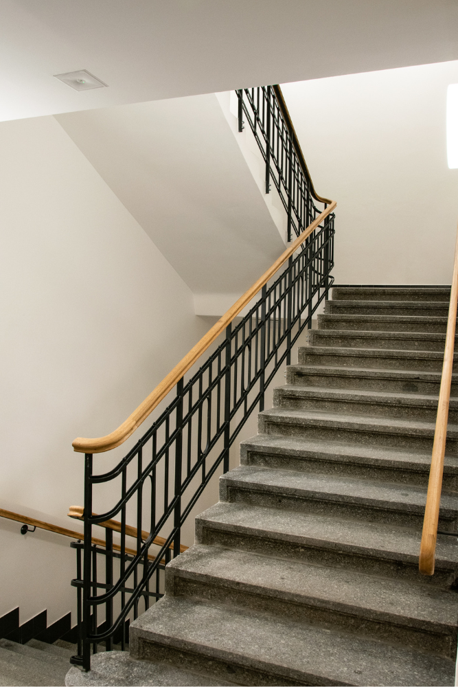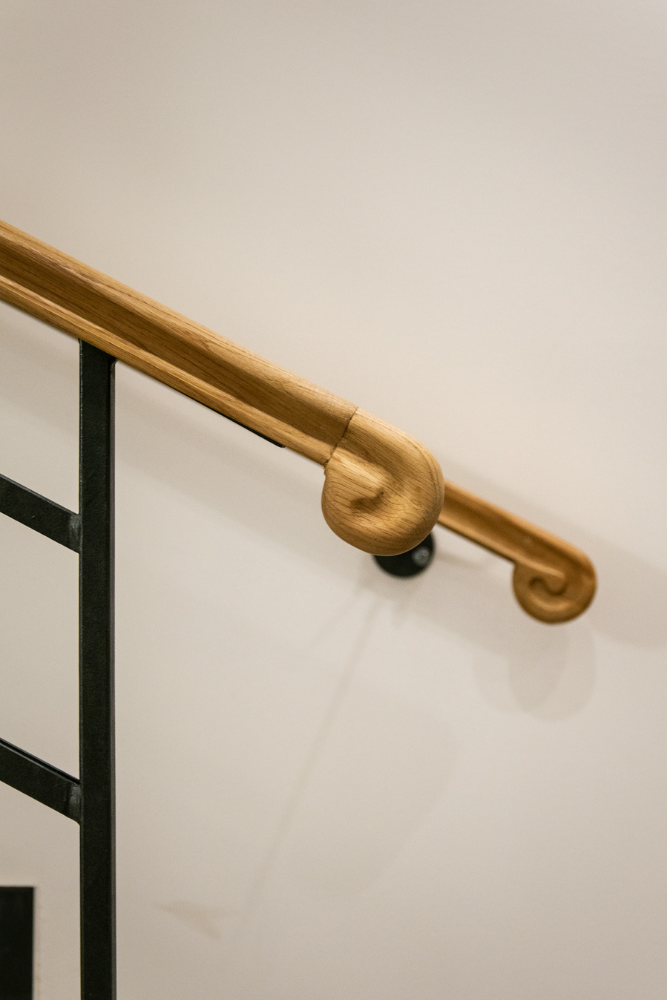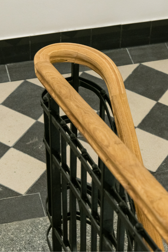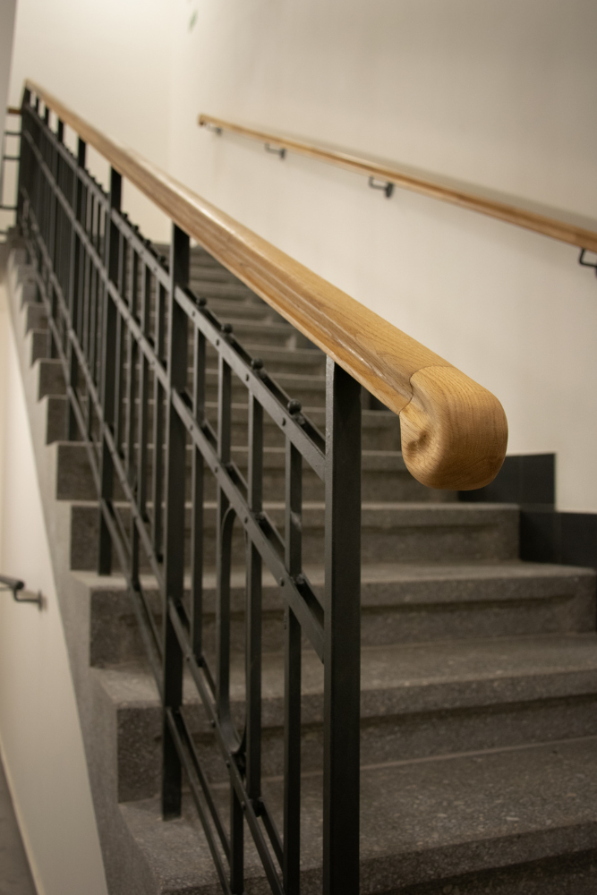 V rámci této realizace jsme navrhli a dodali interiérové zábradlí s masivním dubovým madlem, které bylo tvarováno pomocí 3D frézování. Celý systém zábradlí byl řešen jako kombinace původní ocelové konstrukce s dřevěným madlem, přičemž důraz byl kladen na ergonomii, plynulost tvarů a precizní napojení jednotlivých prvků.
