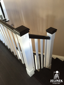 Klíčovým prvkem této realizace je spojení masivních stupňů a zábradlí s kulatými příčkami, které interiéru dodávají vzdušnost a moderní vzhled.