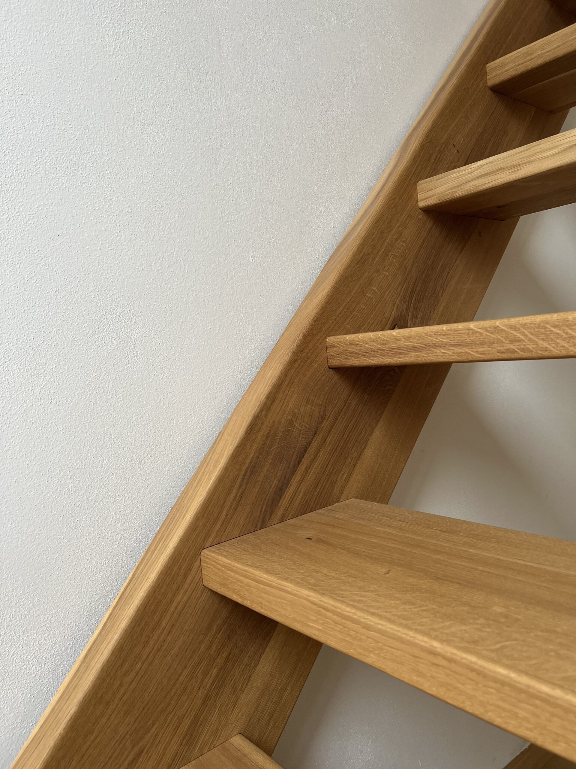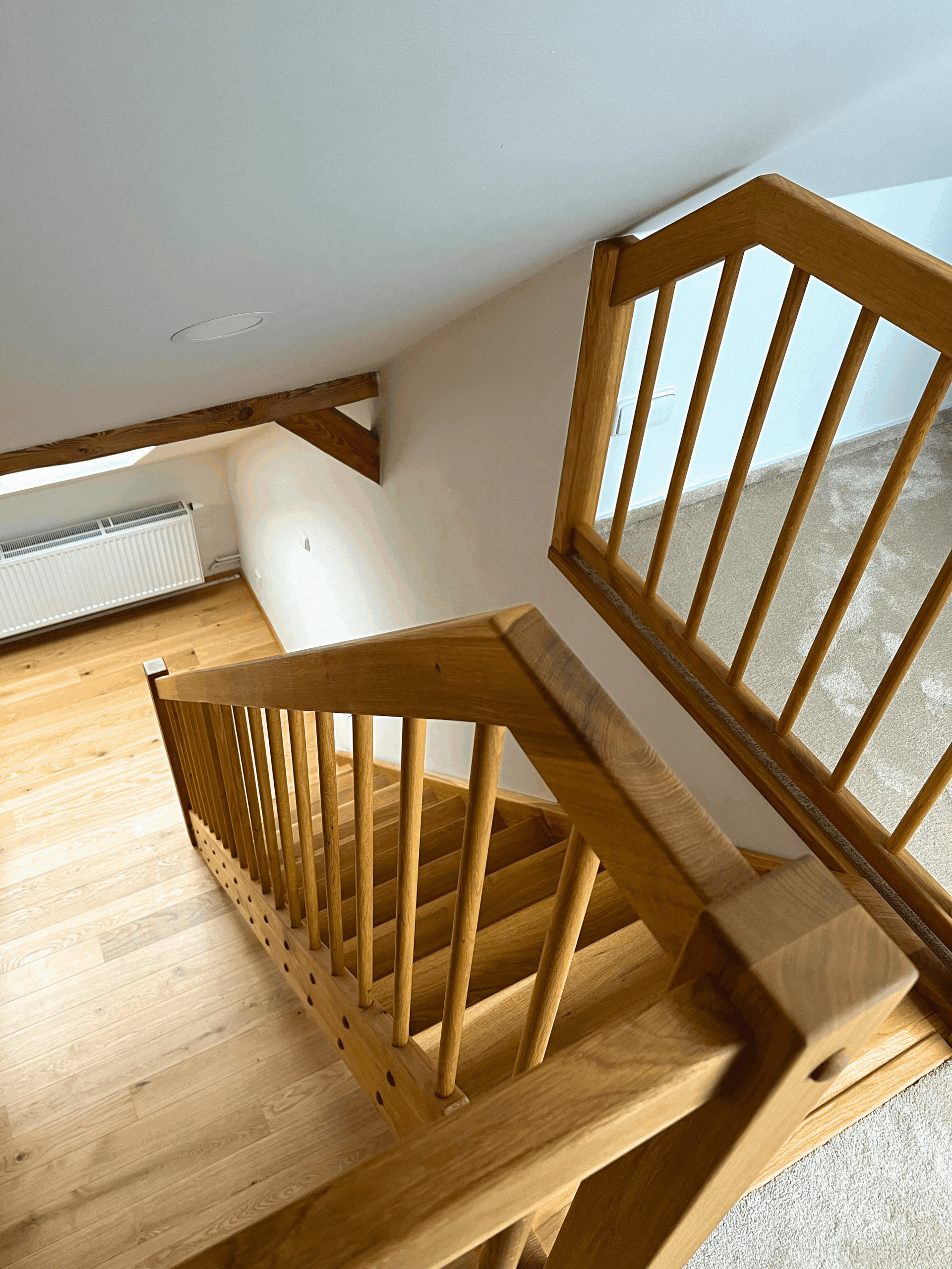 Naše realizace celodřevěného schodiště z dubového dřeva představuje dokonalou kombinaci elegance, funkčnosti a precizního řemeslného zpracování. Klíčovým prvkem je spojení masivních stupňů a zábradlí s kulatými příčkami, které interiéru dodávají vzdušnost a moderní vzhled. Zvolená zadlabaná schodnice bez podstupňů přináší řadu výhod – schodiště díky ní působí odlehčeně, což je ideální pro menší nebo minimalisticky zařízené prostory.