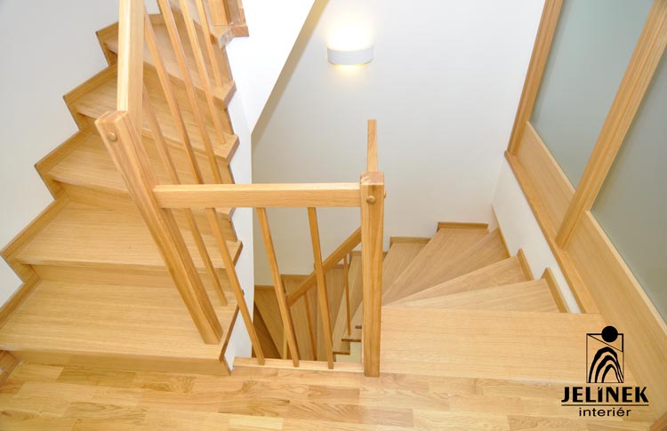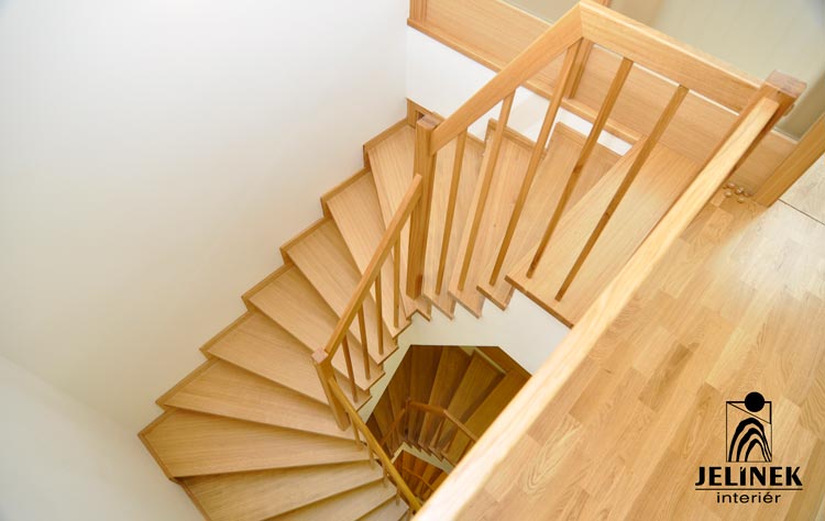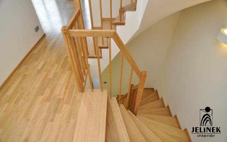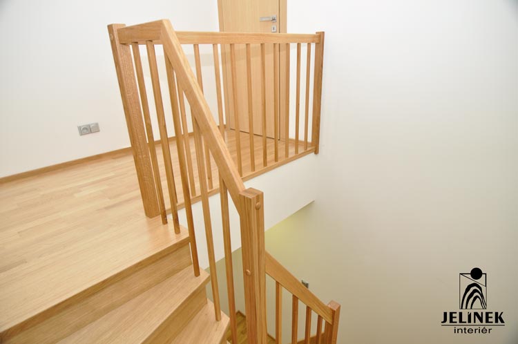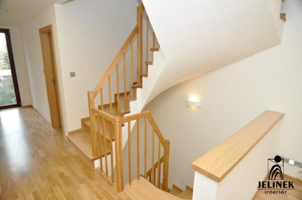 Klíčovým prvkem této realizace je spojení masivních stupňů a zábradlí s kulatými příčkami, které interiéru dodávají vzdušnost a moderní vzhled.