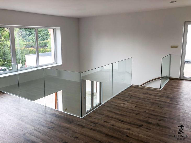 Celoskleněné zábradlí ve výkrytu přináší čistý design, maximální bezpečnost a nerušený výhled do interiéru.