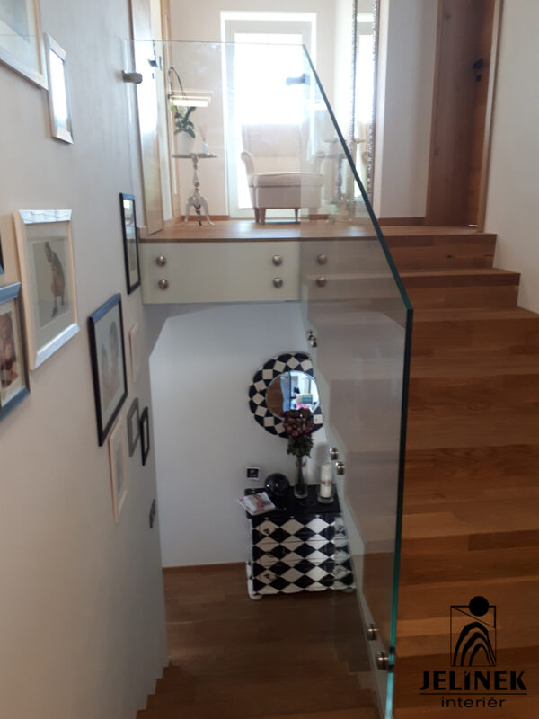 Realizovali jsme celoskleněné zábradlí podél schodiště s masivním dubovým madlem.