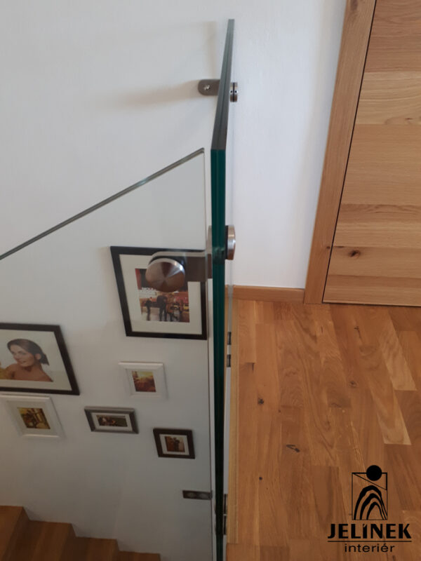 Toto skleněné zábradlí podél schodiště je kotvené do stropní konstrukce a do bočnice schodiště.