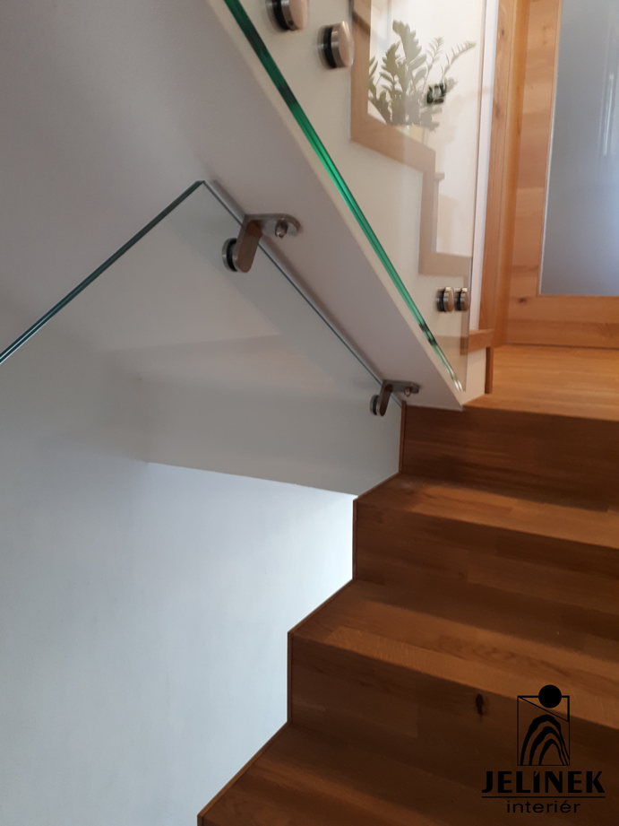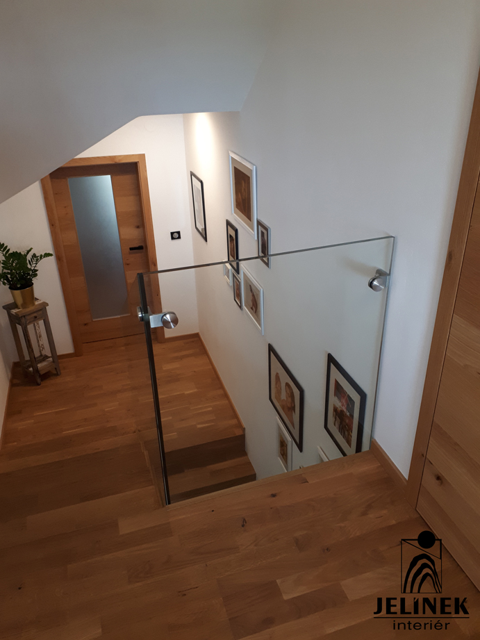 Realizovali jsme celoskleněné zábradlí podél schodiště s masivním dubovým madlem.