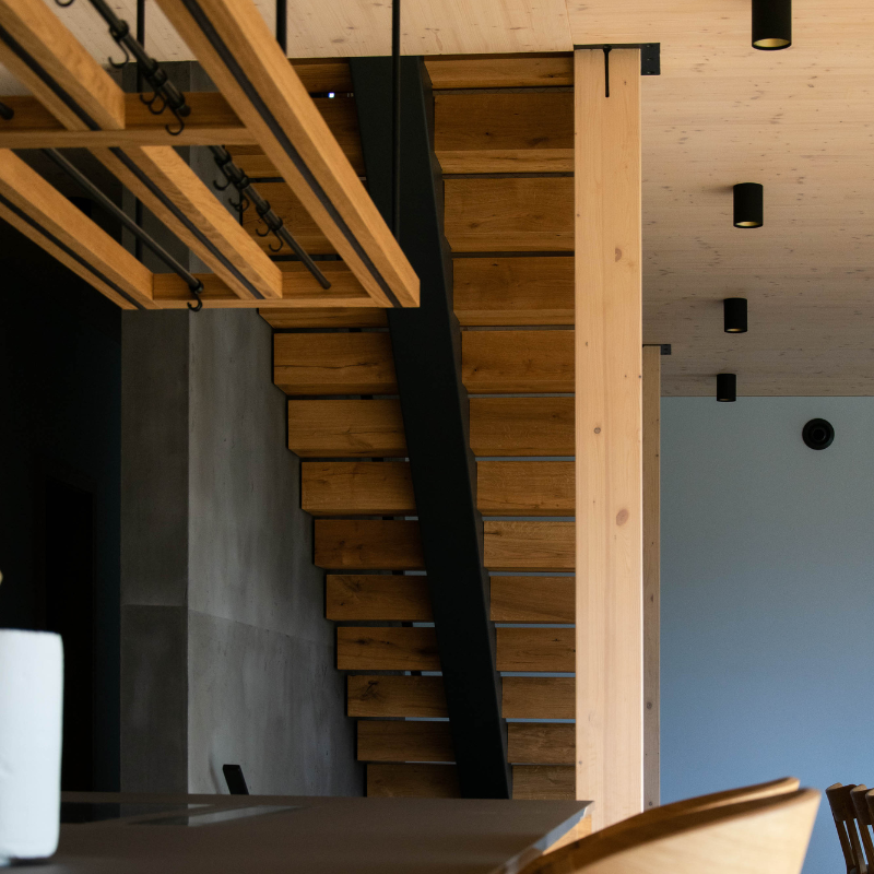 Bukové dřevo dodává prostoru teplo a přirozený vzhled, zatímco samonosná konstrukce zajišťuje stabilitu. Tato realizace vyřešila přístup do druhého patra v mezonetovém podkrovním bytě.