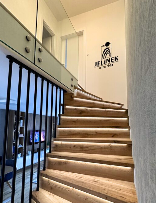 Moderní obklad schodiště s tónovaným dřevem a celoskleněným zábradlím působí vzdušně a elegantně. LED podsvícení zvýrazňuje každý stupeň a dodává prostoru jedinečnou atmosféru.