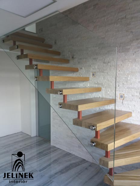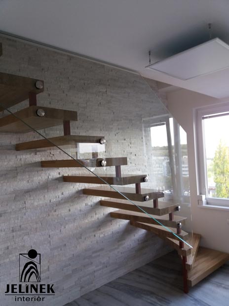 Schodiště obkládané dřevem a celoskleněné zábradlí