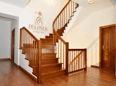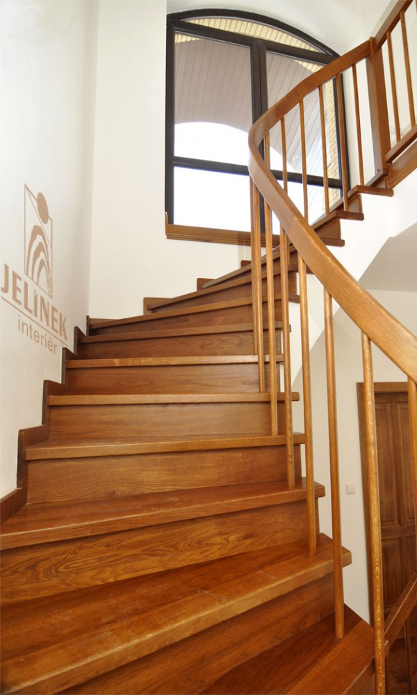 Dřevěný obklad schodiště je tvořen podstupnicemi a olištováním. Zábradlí je specifické ve svém ohebníkovém provedení, tzn. dřevo je ohnuto, což dodává interiéru dynamickou křivku. Dřevěné olištování schodiště je velice praktické pro úklid a svým způsobem schodiště elegantně zakončuje u zdi.
