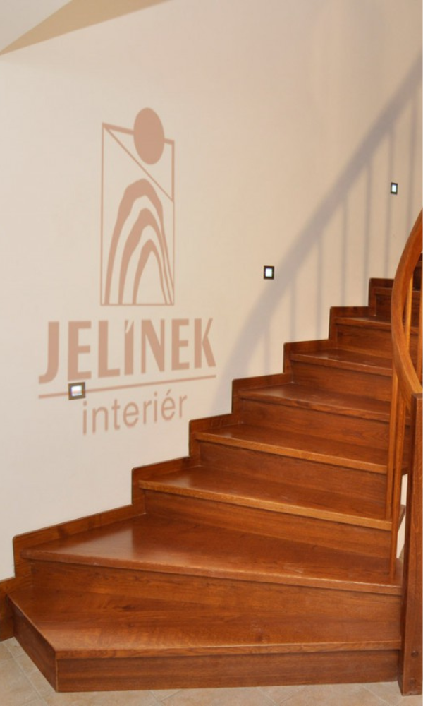 Dřevěné schodiště je vyrobeno z masivního dubu, který je mořen do barevného tónu stejného, jako v případě masivních podlah. Dřevěné schody a ostatní dřevěné prvky realizace interiér ohřívají svou teplou barvou a domov zútulňují. Dubový masiv je tradiční materiál pro schody, a z funkčního hlediska je také velmi trvanlivý. Betonový monolit je obložen Dubovým masivem.