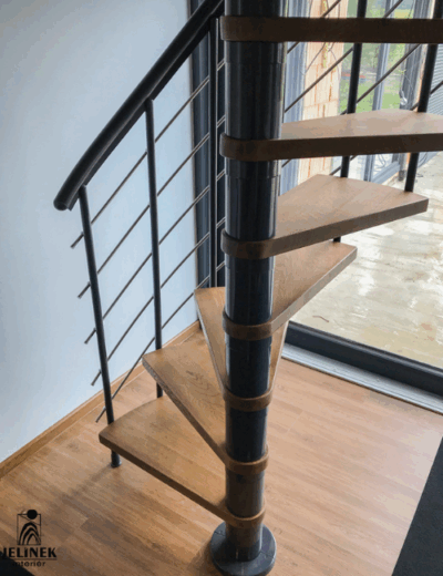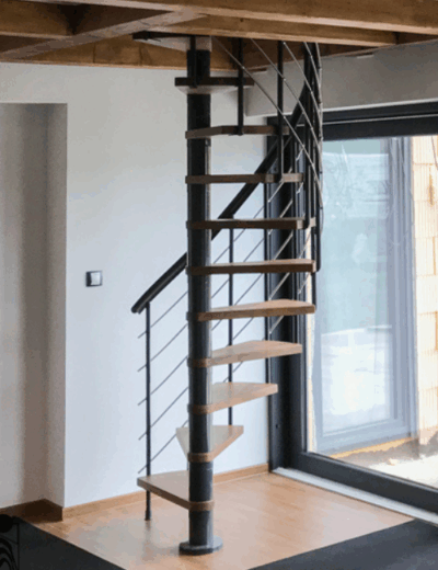 Námi vyrobené a namontované prostorově úsporné točité schody do patra. Na přání zákazníka jsme schodiště barevně natónovali do odstínu trámků a podlahy. Výroba byla zkombinovaná s typovým výrobkem a díky tomu se nám podařilo držet cenu schodů relativně nízko.