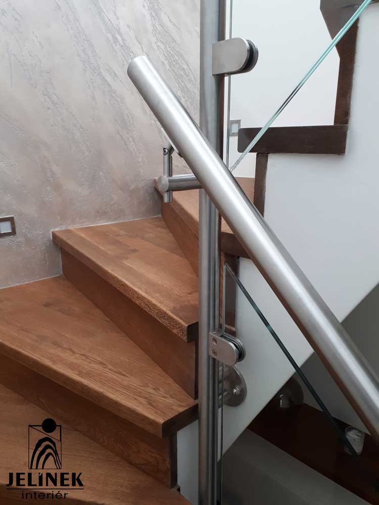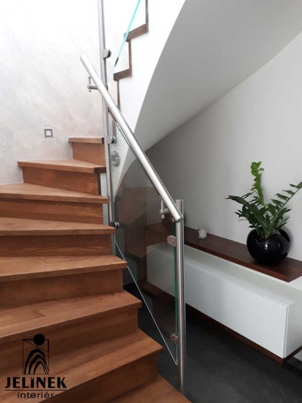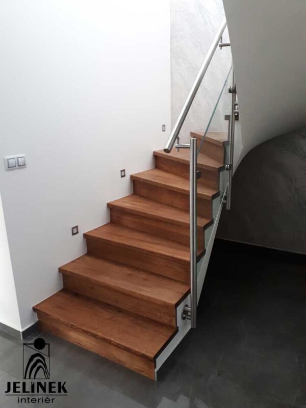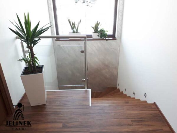 Schodiště obkládané dřevem a celoskleněné zábradlí