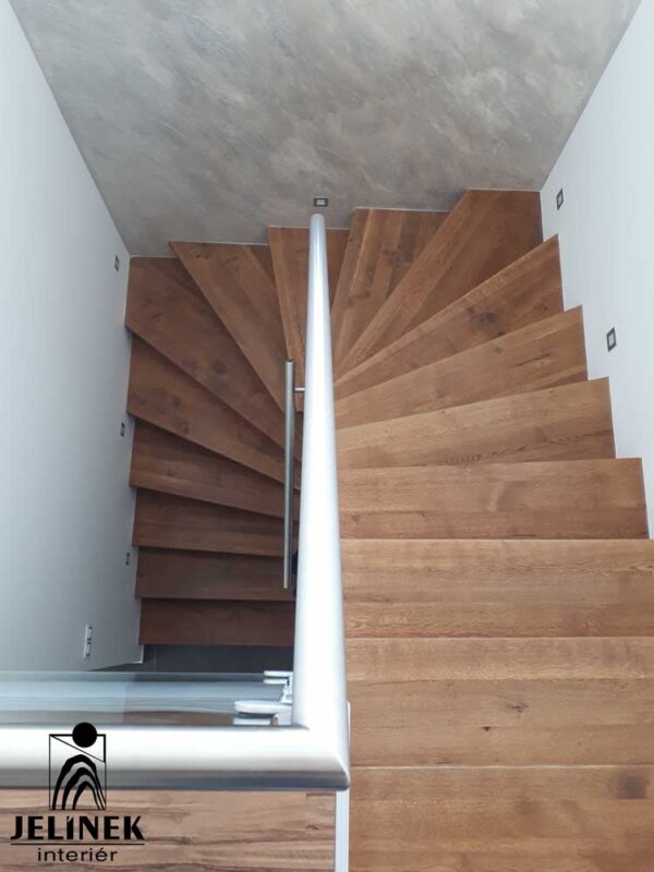 Samonosné schodiště s olejovoskovou úpravou, nerez svislá výplň