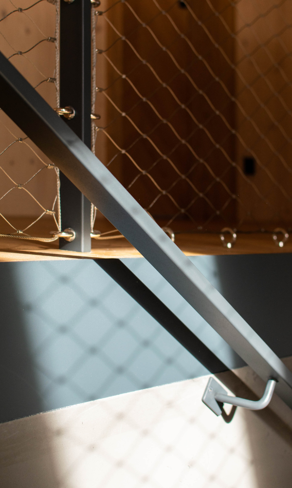 Prutové zábradlí přes dvě podlaží vytváří vzdušný a otevřený prostor. Je ideální pro moderní interiéry, kde chcete zachovat světlo a prostornost, aniž byste obětovali bezpečnost.
