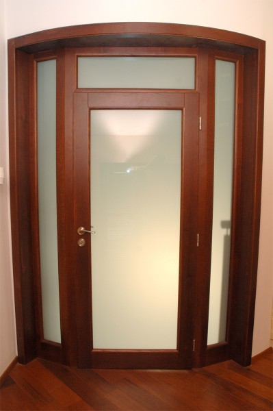 Dveře jsou zaskleny v bezpečnostní úpravě Stratobel 8,4 mm – mléčné sklo. Dalším specifickým prvkem této realizace bylo obložení obloukové zdi, které doplňuje ladnost všech detailů v objektu.
