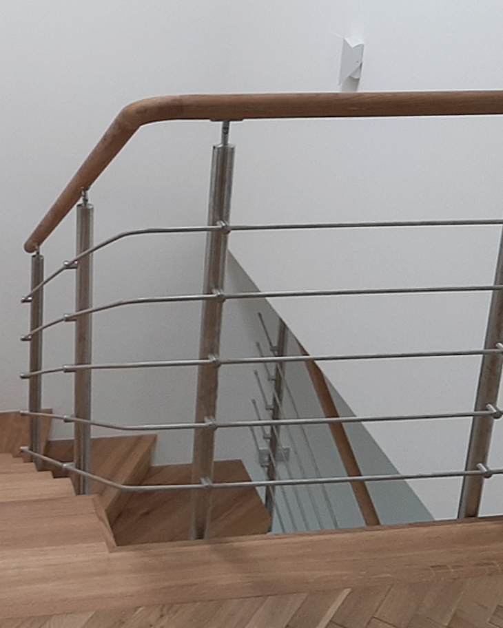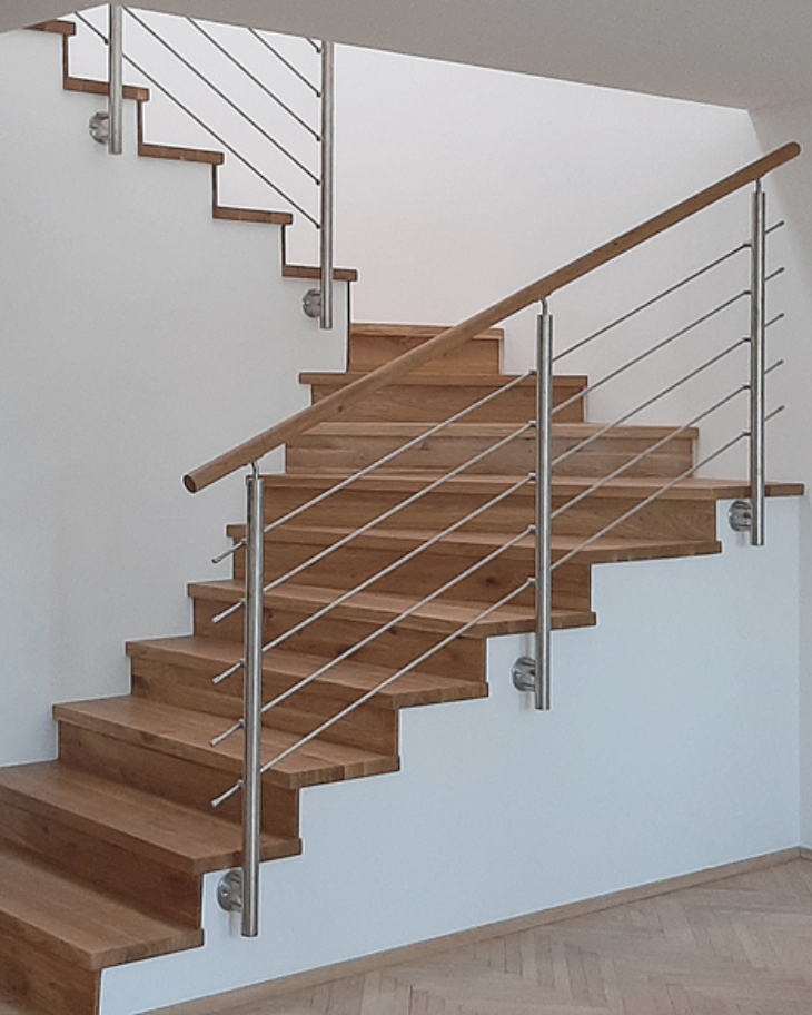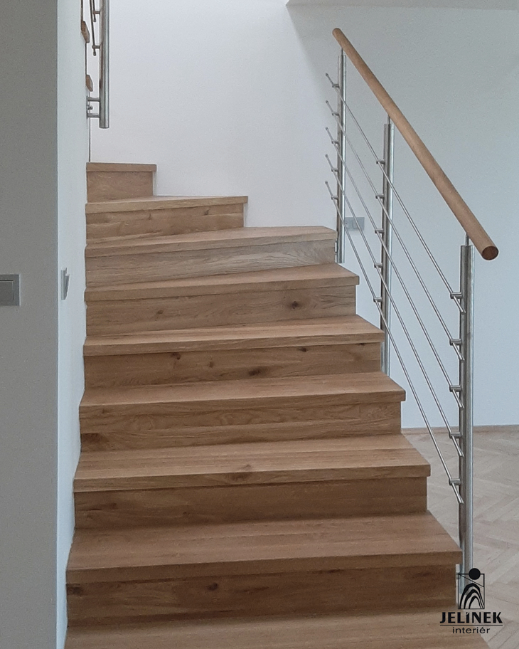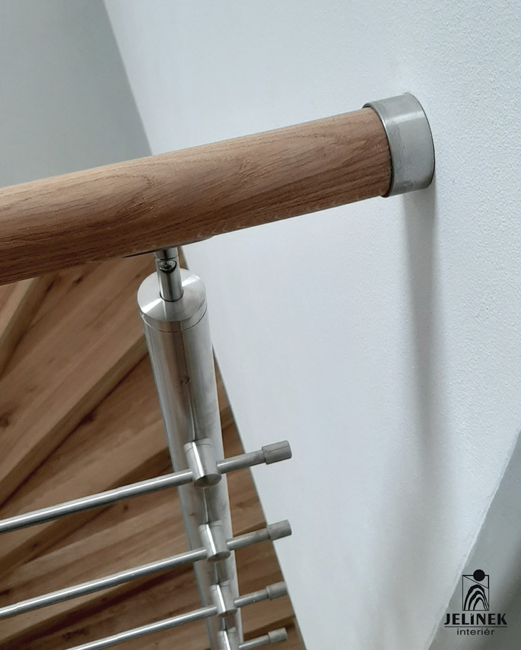 Představujeme Vám náš nejžádanější typ nerezového zábradlí, které představuje ideální volbu pro současné moderní interiéry. Jeho design sází na minimalistickou estetiku a nadčasovost, díky čemuž zůstává vizuálně atraktivní i po mnoha letech. Tato nerezová konstrukce je osazena vodorovnou prutovou výplní, která zajišťuje maximální bezpečnost při zachování vzdušnosti prostoru. Sestavu doplňuje dřevěné madlo, nejčastěji v provedení buk nebo dub, které barevně ladíme přesně podle odstínu podlahy či schodišťových stupňů. V rámci této konkrétní realizace jsme dodávali také obklad schodiště vyrobený z masivního dubu v povrchové úpravě rustik, což vytváří harmonický celek s nerezovými prvky.