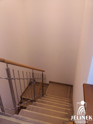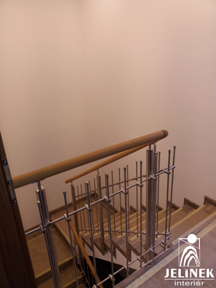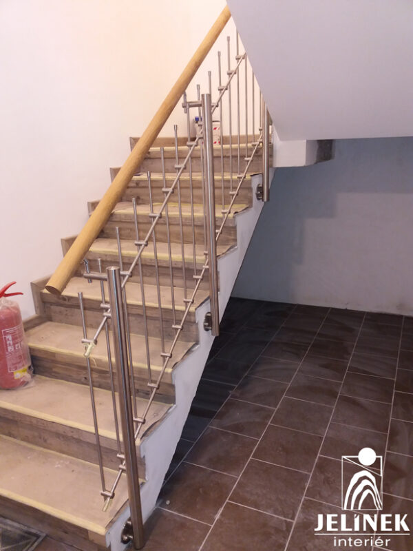 Obklad schodiště s nerezovým zábradlím