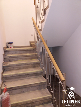 Obklad schodiště s dubovým zábradlím s hranatou vertikální výplní