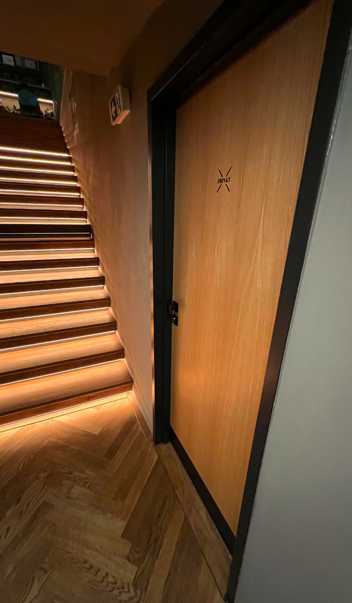 Kombinace teplých dřevěných tónů a hluboké černé vytváří elegantní kontrast, jenž perfektně zapadá do konceptu moderních a designově promyšlených toaletních prostor restaurace Špejle. Tato volba nejen podtrhuje exkluzivitu interiéru, ale zároveň přináší funkční a esteticky vyvážené řešení, které obstojí i v náročném provozu restaurace.