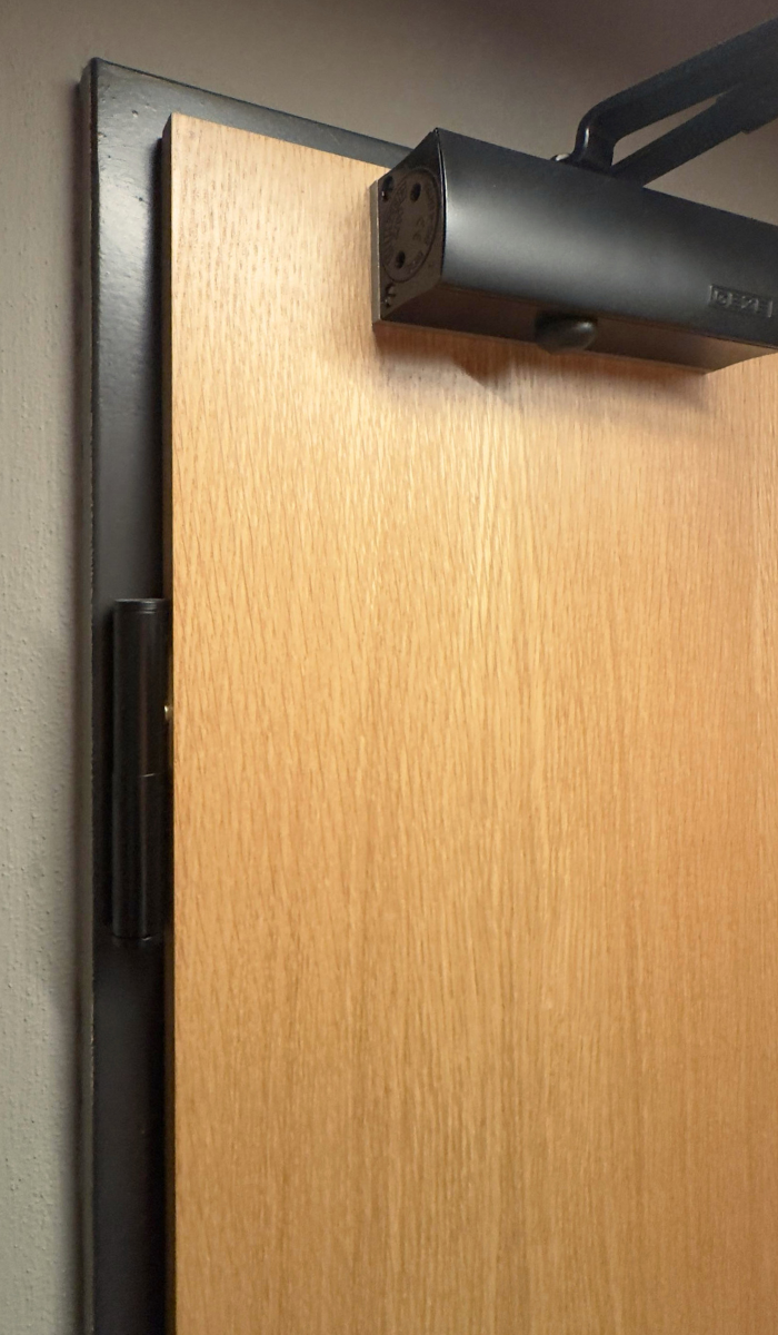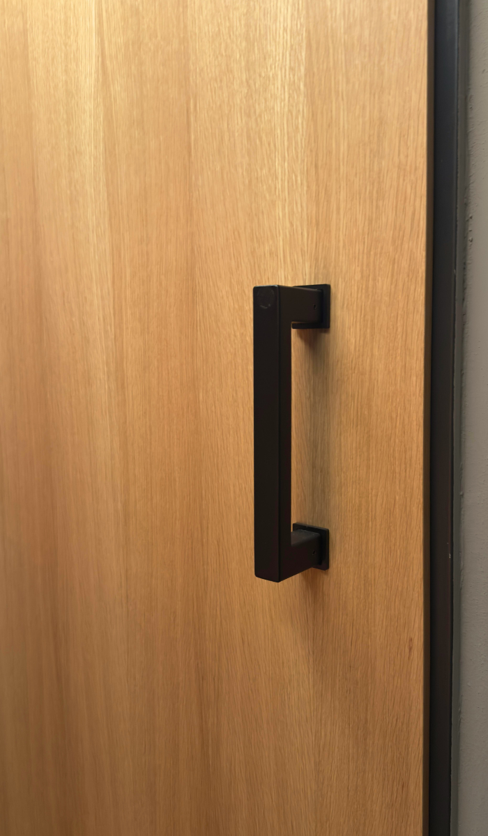 Abychom zajistili dlouhou životnost dveří i při vysoké frekvenci používání, opatřili jsme jejich spodní část (prvních 15 cm) ochranným okopovým plechem. Tento prvek, lakovaný do RAL 9005 (černá barva), chrání dveře před mechanickým opotřebením a zároveň stylově ladí s celkovým designem interiéru.