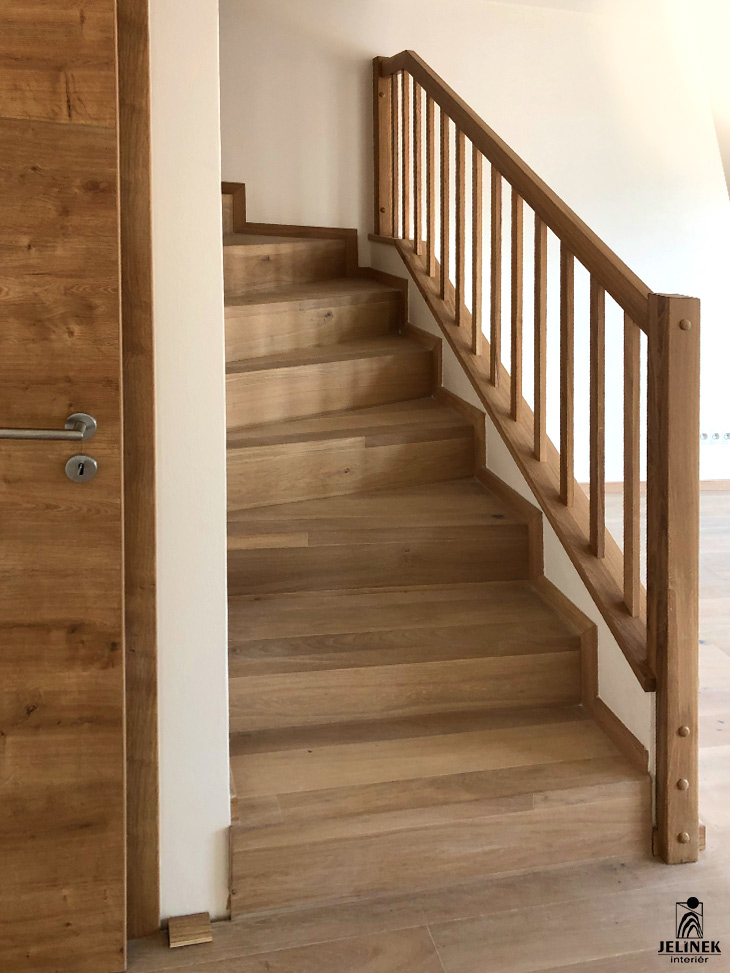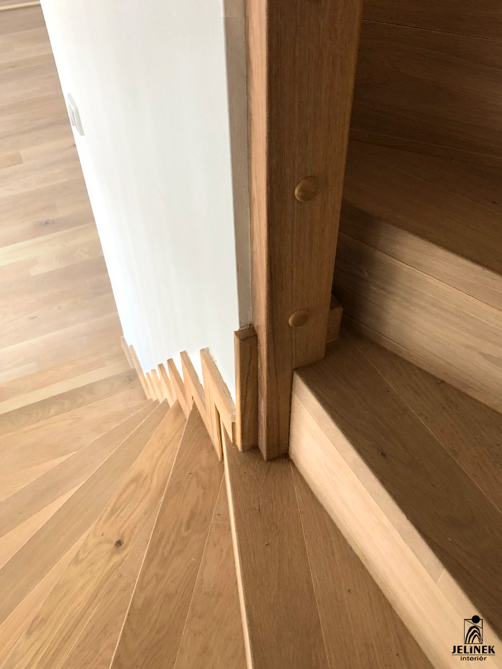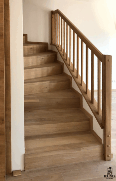 Masivní dubový obklad schodiště se zábradlím
