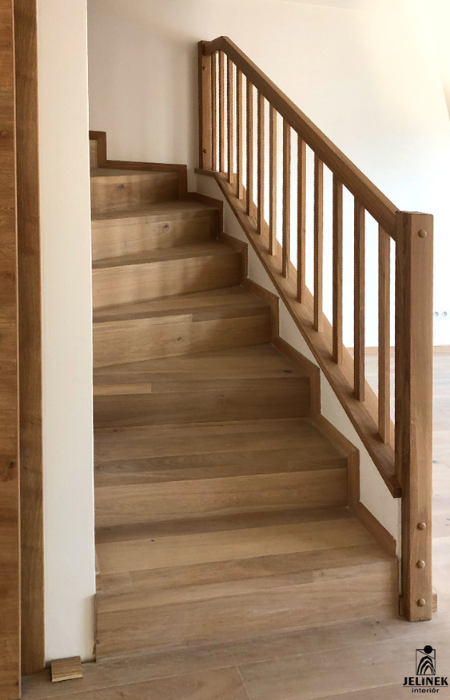 Klíčovým prvkem této realizace je spojení masivních stupňů a zábradlí s kulatými příčkami, které interiéru dodávají vzdušnost a moderní vzhled.