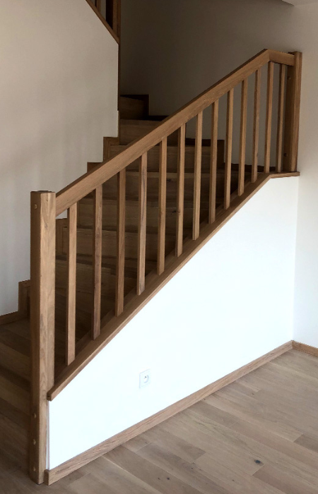 Dubové zábradlí ladící s dubovým schodištěm vytváří harmonický a teplý vzhled. Přírodní dřevo dodá interiéru příjemnou atmosféru a hodí se do klasických i moderních prostor.