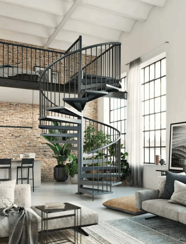 Konstrukce tohoto schodiště nevyžaduje podpěry, což umožňuje volný průchod světla a zachovává pocit prostornosti. V tomto konkrétním případě je vertikální výplň tvořena ocelovými pruty, což schodišti dodává industriální dotyk.