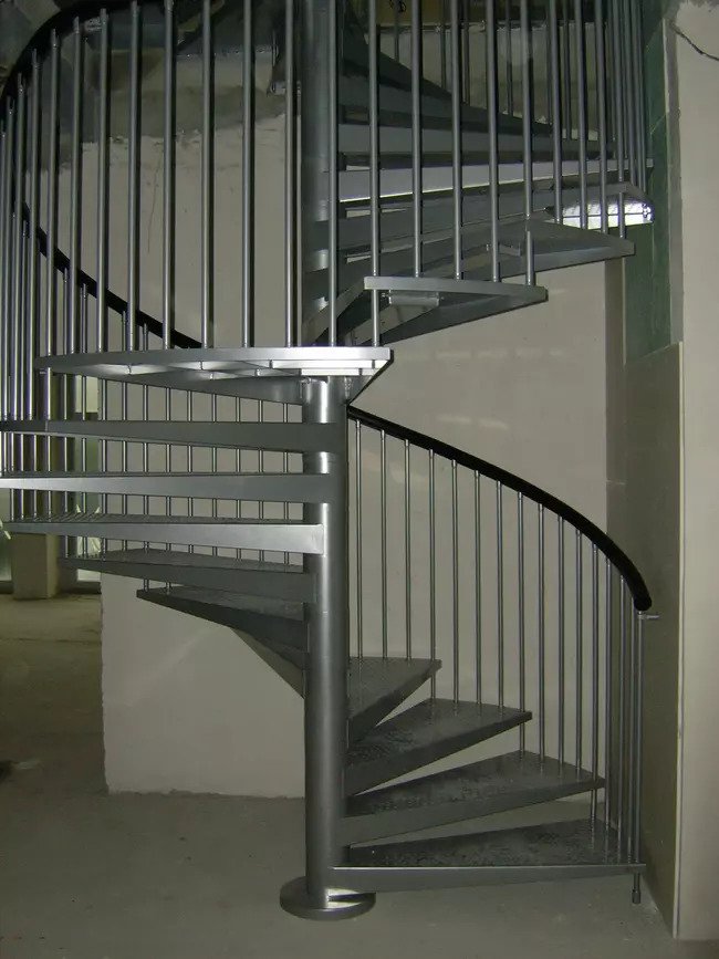 Toto robustní vřetenové schodiště bylo vyrobeno ze žárem pozinkovaného kovu, ale existuje také možnost varianty z pozinkovaného děrovaného plechu, nebo Trimaxu.