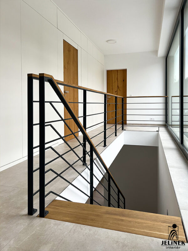 Klíčovým prvkem této realizace je spojení masivních stupňů a zábradlí s kulatými příčkami, které interiéru dodávají vzdušnost a moderní vzhled.