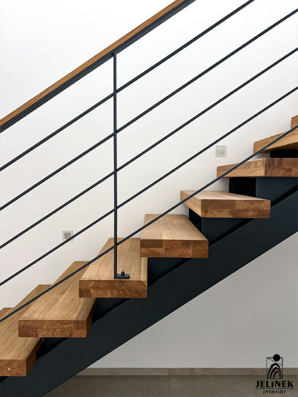 Samonosné schodiště vyrobené z masivního buku je v této konkrétní realizaci povrchově upraveno tónovacím olejem do odstínu WENGÉ, pro navození moderní nálady.