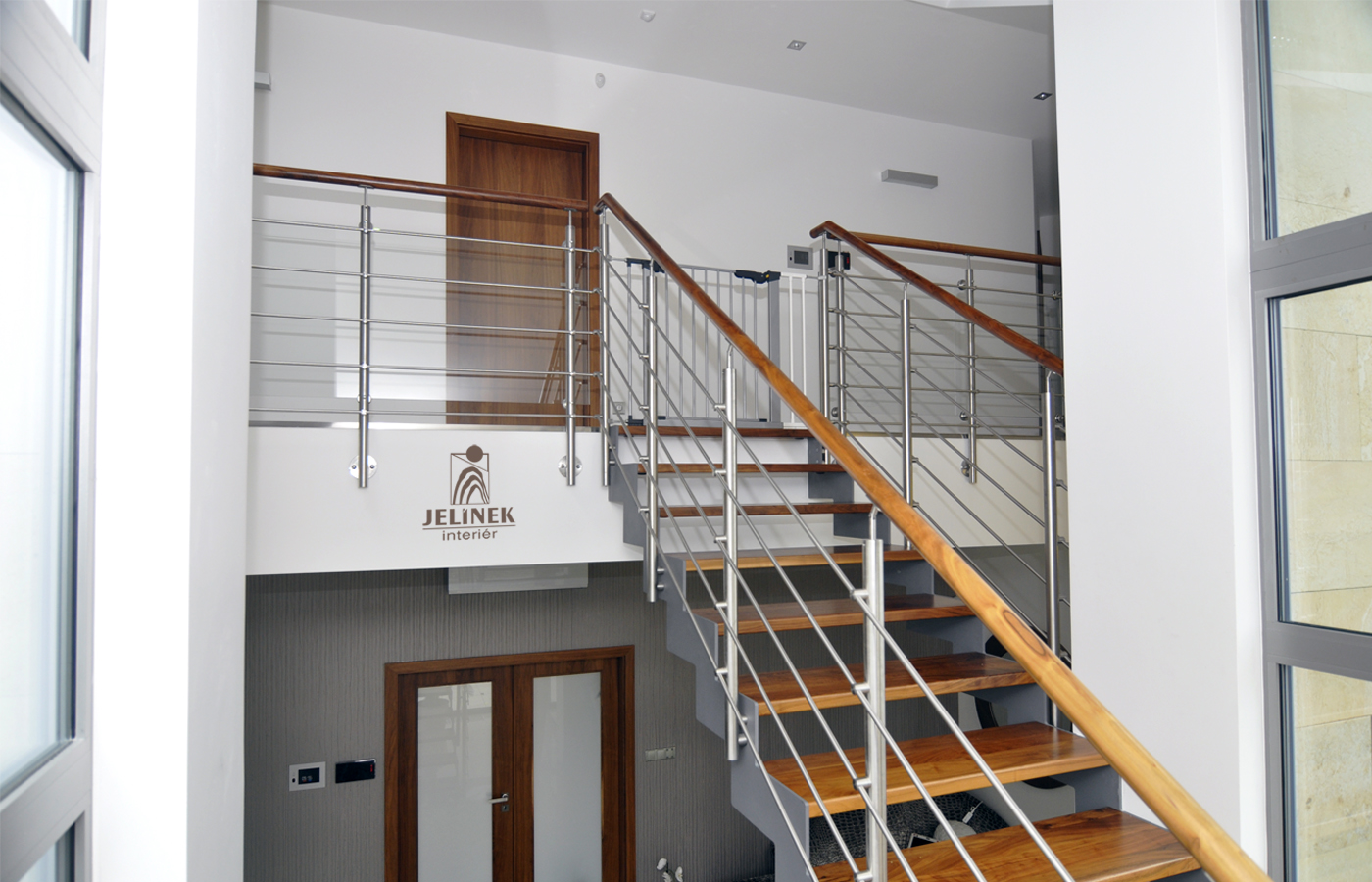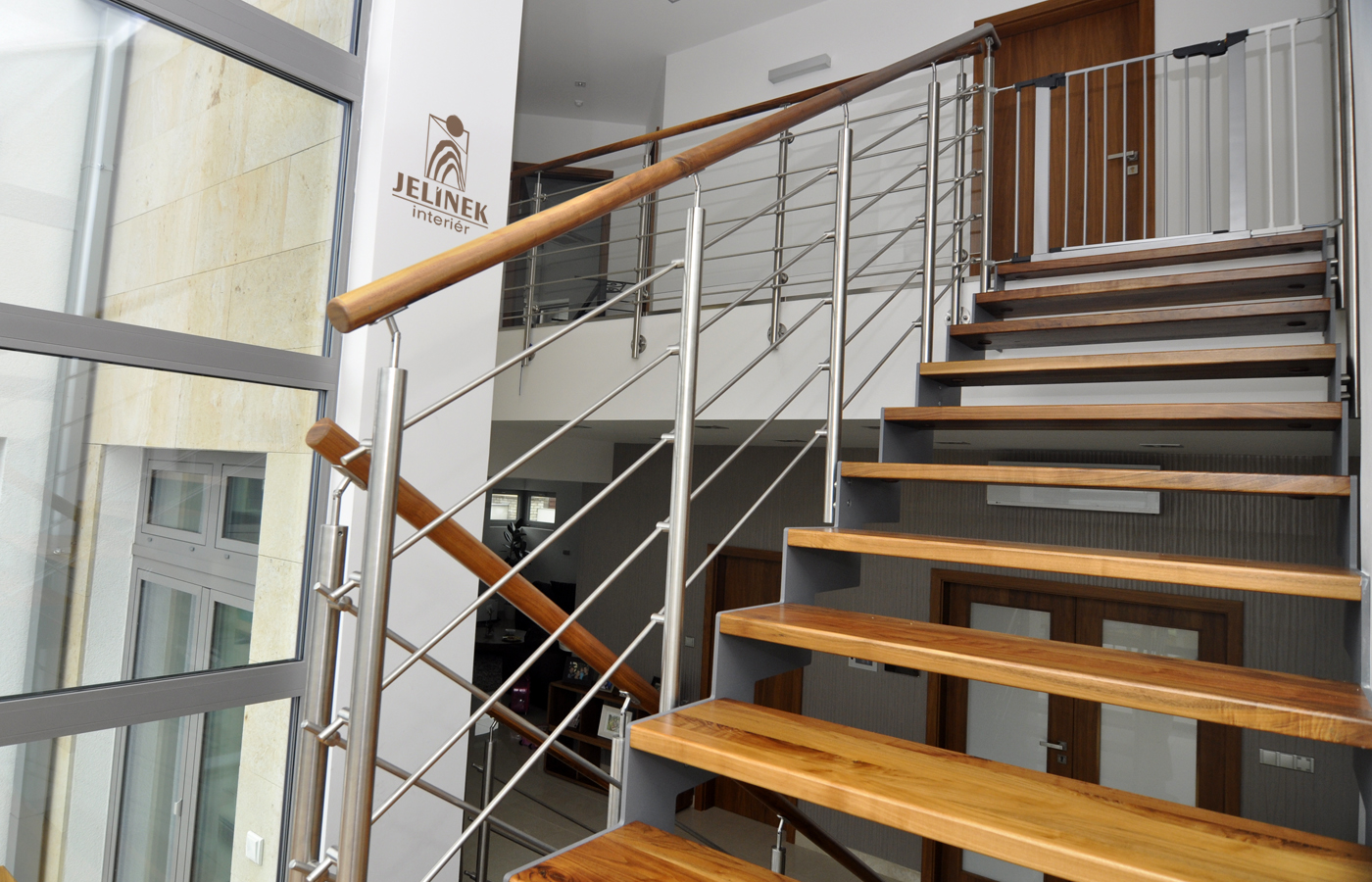 Klíčovým prvkem této realizace je spojení masivních stupňů a zábradlí s kulatými příčkami, které interiéru dodávají vzdušnost a moderní vzhled.