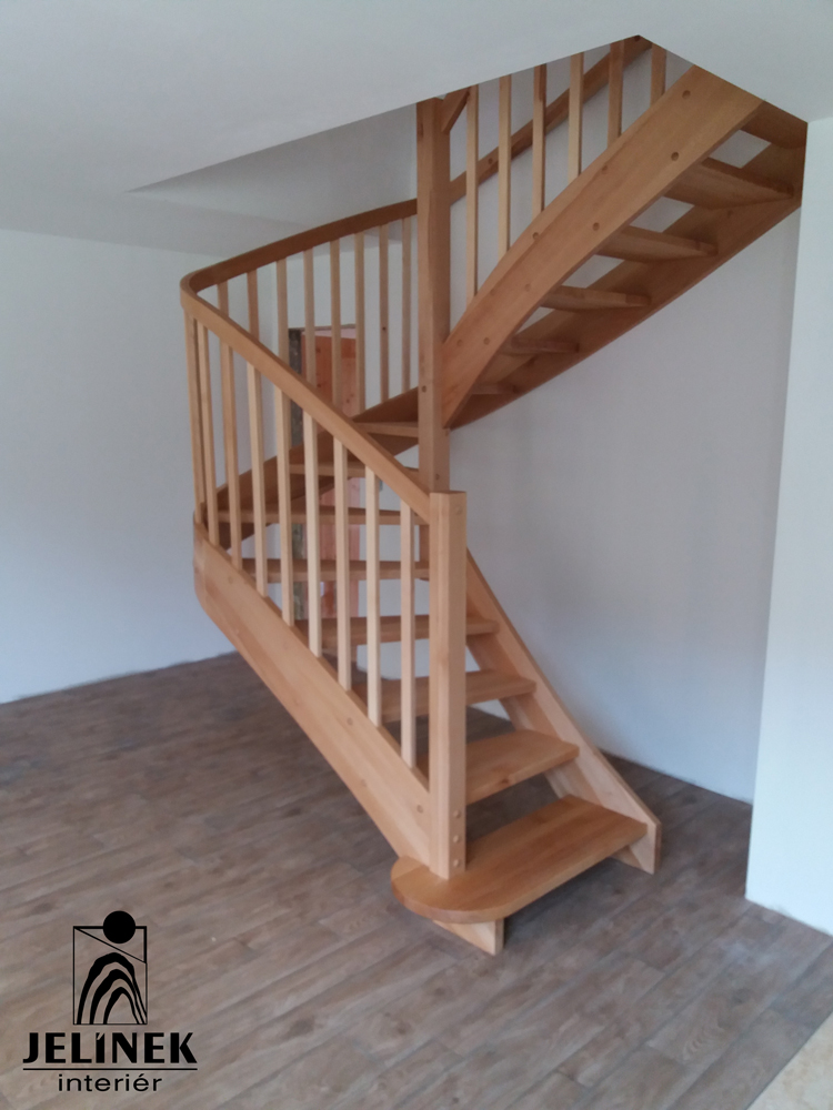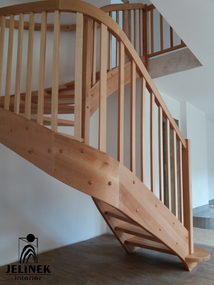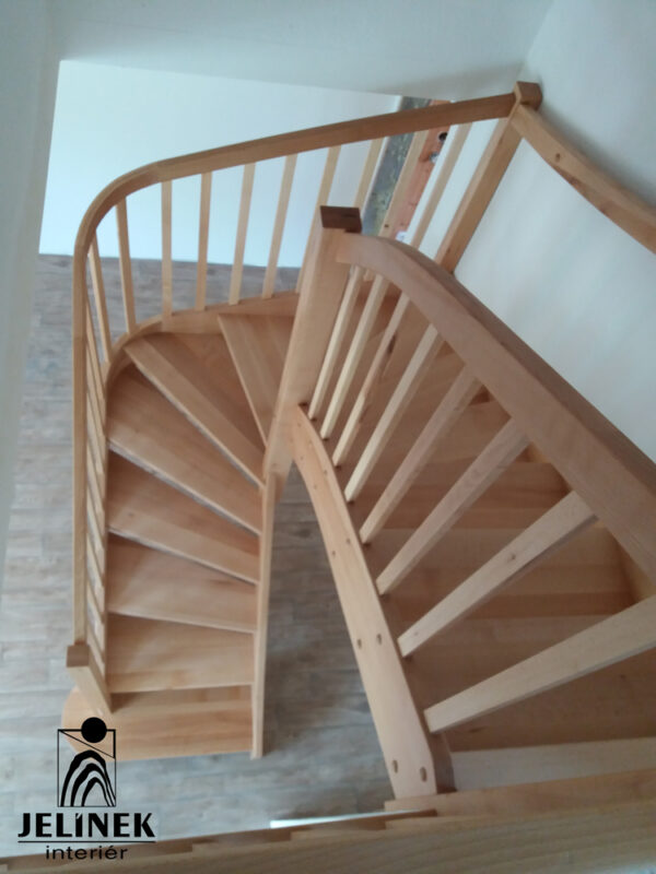 Samonosné schodiště vyrábíme z masivu, v tomto případě se jedná o bukové dřevo. Povrchová úprava je transparentní olejovosk. Zákazník měl požadavek na oblé provedení z důvodu umístění schodiště do prostoru, a proto jsme navrhli toto ohebníkové schodiště, kde je část schodnice vylepena z dřevěných masivních bukových švarten.