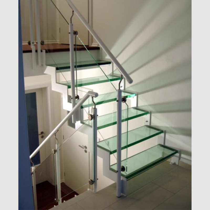 Kombinace táhlového zábradlí podél schodiště a celoskleněného zábradlí v horním patře. Skleněné zábradlí propouští světlo a udržuje prostor vzdušný, zatímco závěsná konstrukce zajišťuje stabilitu.